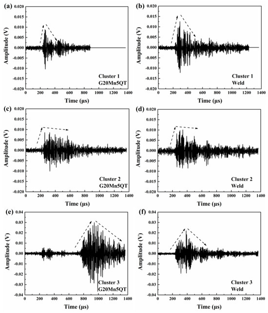 Waveforms of typical AE signals in different clusters: (a) cluster 1 signals of G20Mn5QT; (b) cluster 1 signals of welds; (c) cluster 2 signals of G20Mn5QT; (d) cluster 2 signals of welds; (e) cluster 3 signals of G20Mn5QT; (f) cluster 3 signals of welds.