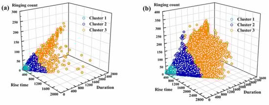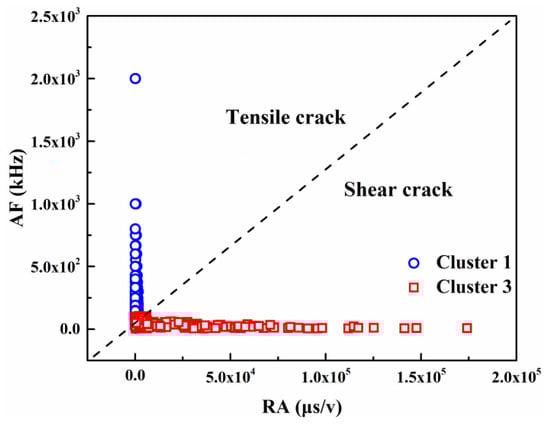 To validate that the signals in cluster 3 are generated by shear crack fractures, the correlation between the RA and AF parameters is used. These two parameters are defined in Equations (7) and (8). RA is the ratio of rise time to peak amplitude and is measured in μs/v. AF is the ratio of ringing count to duration and is measured in kHz. The AE signal, due to the shear crack fracture, has a high RA and a low AF; while the AE signal, due to the tensile crack fracture, has a low RA and a high AF [53,55]. It can be found that cluster 3 signals distribute widely along the RA and have a small distribution range along the AF (see Figure 11), while cluster 1 signals are the opposites of cluster 3 signals. Therefore, it can be reliably concluded that the mechanism of cluster 3 signals is related to shear crack fractures: