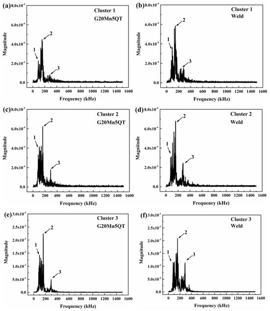 Frequency spectra of typical AE signals in different clusters: (a) cluster 1 signals of G20Mn5QT; (b) cluster 1 signals of welds; (c) cluster 2 signals of G20Mn5QT; (d) cluster 2 signals of welds; (e) cluster 3 signals of G20Mn5QT; (f) cluster 3 signals of welds.