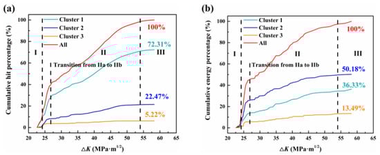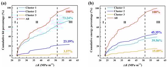 For G20Mn5QT cast steel, the increase in the AE hit is primarily due to the tensile crack fractures, whose contribution is much greater than that of clusters 2 and 3. However, cluster 2 has the largest contribution with regard to the increase in AE energy, and the corresponding contribution of cluster 1 is the second largest, being only slightly less than that of cluster 2. At the end of the test, clusters 1, 2, and 3 are noted to contribute 73.24%, 23.19%, and 3.57% to the cumulative hit and 39.56%, 45.35%, and 15.09% to the cumulative energy, respectively, as shown in Figure 14. At fatigue stage I and the beginning of stage II, both the hit and energy exhibit a fast growth rate.
