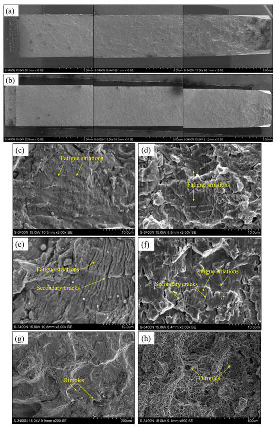 The fatigue fracture morphologies of the G20Mn5QT cast steel and the weld, after they were corroded using 5% alcohol nitrate solution, were observed using an S-3400N scanning electron microscope at the School of Material Science and Engineering, Tianjin University. Compared to that of G20Mn5QT, the crack surface of the butt weld is relatively flatter and smoother, and the necking zone of the butt weld appears much later (see Figure 16a,b). In stage I, the micromorphologies of both G20Mn5QT and the butt weld exhibit flat facets and fine fatigue striations with little secondary cracks, as shown in Figure 16c,d. As the fatigue crack propagates into stage II, the spacing of fatigue striations becomes wider and extremely evident. At the same time, secondary cracks appear extensively, as shown in Figure 16e,f. When the crack grows into stage III, dimples, tearing ridges, and secondary cracks begin to appear extensively. At the end of the cracks, ductile overload fracture morphologies characterized by microvoids and microcracks are predominant in the crack surfaces, as shown in Figure 16g,h.