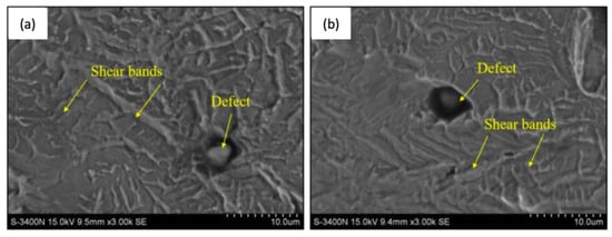 It is worth noting that shear bands are observed on the fracture surfaces of G20Mn5QT and the butt weld. Furthermore, the shear bands are not continuously distributed along the surface but occur probabilistically around defects caused by casting or welding, as shown in Figure 17a,b. Therefore, the shear cracks appearing in the fracture surface of a CT specimen that should primarily exhibit tensile cracks may be caused by the multi-state of stress and strain occurring due to the casting or welding defects. This phenomenon verifies the existence of cluster 3 signals generated by shear crack fractures and the discontinuous occurrences pertaining to the discontinuous distributions of defects. Furthermore, as the average energy released by a shear crack fracture of G20Mn5QT is less than that of the weld, the material weakening caused by the defects of G20Mn5QT is larger than that of the weld.