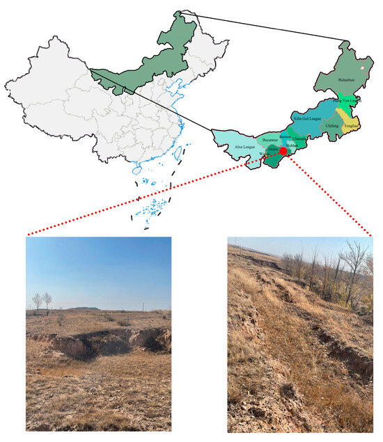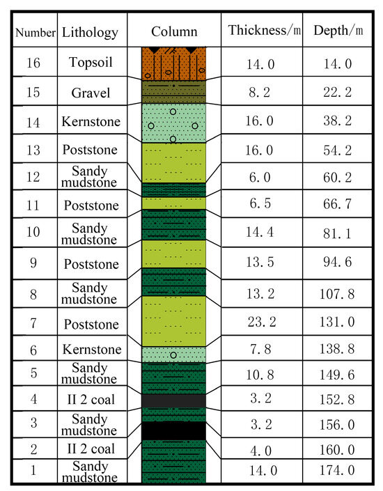 The Gao Jialiang Coal Mine is situated in northeastern Ordos City, Inner Mongolia. The mining area is characterized by low-rise hills with sparse vegetation and widely distributed quaternary strata areas, which belong to the semi-desert region with a fragile ecological environment (Figure 1). The middle coal seam being mined is located at a depth of approximately 160.0 m, with an average mining thickness of 4.05 m. The coal seam is nearly horizontal, with a dip angle ranging from 0° to 3° and an average of 1.5°. The roof layer of the working face of 20313, characterized by its cylindrical shape (Figure 2), primarily consists of mudstone, sandy mudstone, and fine-grained sandstone. The bedrock’s loose layer, approximately 22.2 m thick, primarily consists of wind-blown and loose sediment.