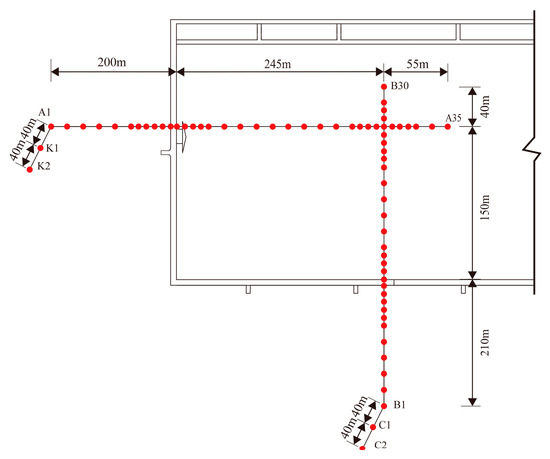 To monitor surface deformation and ground fissure development during mining at the working face of 20313, observation lines A (surface direction) and B (tendency direction) were established prior to mining. Line A spans 500 m, with measuring points spaced 20 m apart, except near the cutting face and the goaf boundary where the spacing is reduced to 10 m, resulting in a total of 34 measuring points. Line B extends 400 m, also with 20 m intervals between measuring points, except near the boundary where the spacing is 10 m, leading to 30 measuring points. There were 64 surface movement observation points, including K1~K2 and C1~C2, which are located outside the range of mining influence. Refer to Figure 3 for the detailed layout.