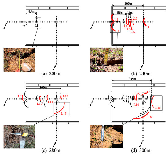 When the working face reached 280 m (Figure 4c), the overall fissure pattern advanced in a “C”, with new cracks (L11) appearing 28 m ahead, and the cutting crack (L9) extending to the mining boundary. At this stage, the working face progressed rapidly at 14 m per day, leading to less surrounding rock damage due to the inability of the rock to fully release pressure and delaying the transmission of overburden load. At a 300-m advancement of the working face (Figure 4d), new cracks (L14, L15) emerged parallel to the working face, while additional diagonal cracks (L17, L18) extended beyond its boundary. The new crack (L16) was 335 m away from the cutting point. The results show that as mining progresses, ground fissures developed in a “C” shape along the middle of the goaf, with boundary fissures extending outward once formed.