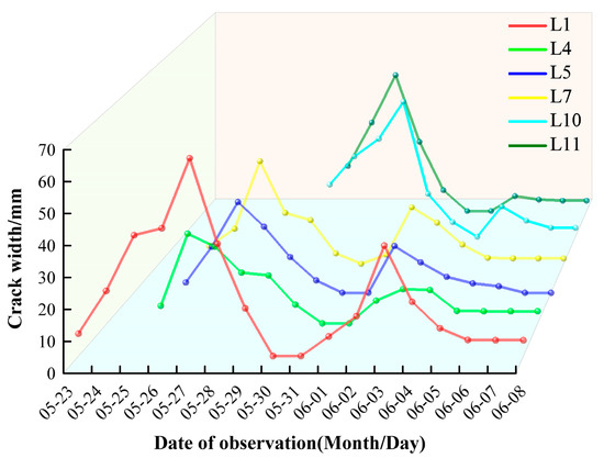 Under high-intensity mining conditions, the width of the six central goaf cracks exhibited a dynamic development process with stages ‘from small to large, rapidly smaller, primary closure, secondary cracking, and final stability’ (Figure 5). The maximum change value of crack width ranged from 29.5 to 63.0 mm with an average of 40.8 mm. The crack width value was quite different, but the development period followed a double “M” peak, where the first peak was higher than the second peak. The maximum peak ratio was 9, and the mean peak ratio was 3.6. Regarding the timeline of crack development, the complete cycle from initial formation to stabilization took 17 days for L1, 15 days for L4, 15 days for L5, 15 days for L7, and 11 days for L10 and L11, averaging 14 days overall. Each of the two “opening-closing” cycles in the crack development process lasted 8 and 9 days on average, with some variations ranging from 6 to 8 days. It also shows the working face of 20313. The developmental period of the dynamic cleft is about 18d and contains two approximately equal-time “open-close” processes. This indicates that the dynamic crack development cycle at the working face of 20313 lasts approximately 18 days and includes two nearly equal “opening-closing” phases. When the coal seam is mined, the damage and destruction of the overlying strata of the coal seam gradually transfer upward, and finally spread to the surface to produce ground cracks. There is a certain lag in the generation of ground cracks, so there is a difference in the time of dynamic ground cracks in the middle of the goaf.