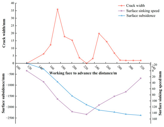 Field observations (Figure 6) indicate that when the working face reached 140 m, a dynamic crack (L7) extended 10 m near observation point A21. During the initial fissure development phase, crack width expanded alongside increases in surface subsidence and subsidence velocity. When the subsidence velocity sharply rose to 136 mm/day, the crack width reached its maximum at 35.9 mm. The crack (L7) began to close when the surface subsidence velocity reached its peak of 145 mm/day as the working face advanced to 220 m. As the working face advanced, surface subsidence increased while the subsidence rate decelerated, indicating the onset of the second cycle of crack width development. During this cycle, local surface subsidence reached a maximum of 2380 mm, and with a subsidence velocity of less than 25 mm/day, the fissure development tended to stabilize.