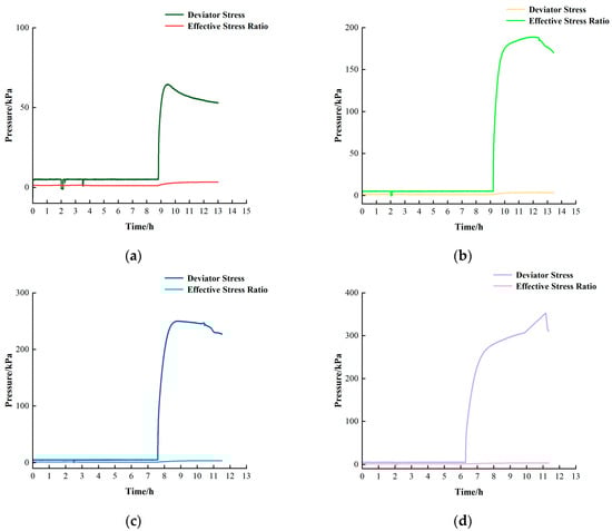 A cylindrical specimen, measuring 50 mm in diameter and 100 mm in height, was prepared following the Geotechnical Test Methods Standard (GB/T50123-2019) [26], ensuring a height-to-diameter ratio (h/D) between 2.0 and 2.5. The “TAS–LF automatic triaxial system” was utilized to conduct a “consolidated-undrained shear test” on the soil samples. The experiment utilized a shear rate of 0.5 mm/min under varying confining pressures of 100 kPa, 200 kPa, 300 kPa, and 400 kPa to simulate different stress conditions. The average results from the four tests were taken as the final mechanical parameters for the corresponding soil samples (Figure 8). The test parameters comprised shear strength, elastic modulus, Poisson’s ratio, internal friction angle, cohesion, and friction coefficient. The test results categorized the loose layers into five distinct types, as outlined in Table 1.