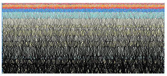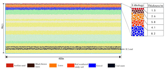Using “PBM” (Parallel Bonding Mode), the preliminary model is first established and brought to a state of static equilibrium under the influence of gravity. Once this balance is achieved, floating particles both inside and outside the model boundaries are removed. The stratigraphy of the working face is segmented into layers with specific mechanical properties [27,28] (refer to Table 2) to precisely depict the characteristics of various rock and soil layers. The numerical model calculations are improved in efficiency and accuracy by optimizing the particle size, setting the particle radius between 0.3 and 0.8 cm. The force balance is recalculated until the unbalanced force ratio is reduced to less than 10−5.