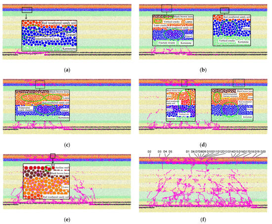 Coal seam mining disrupts and redistributes the original equilibrium of the force chain. As the working face progresses, the strong chain forms an upward arch, leading to instability and destruction at the arch foot and vault (Figure 13a). Meanwhile, the loose layer experiences a minimal mining impact, resulting in damage and a few non-penetrating vertical cracks (Figure 13b). Along with the continued advancement of the working face, goaf above the low strong chain gradually flattened and eventually instability destruction occurred in the new strong chain of the upper rock and gradually developed to the loose layer; the inside of the loose layer is composed of strong chain and weak chain arch groups, weak force chain arch instability damage, and loose layer in a large number of cracks (Figure 13c). At 200 m advancement of the working face, the instability of the strong chain arch above the goaf overlaps, leading to further development and failure of the internal force chain arch group in the loose layer. This results in the breakthrough of cracks in the loose layer and the emergence of ground cracks on the surface (Figure 13d). As the working face is continuously mined (Figure 13e), the strong chain arch in the loose layer is periodically disrupted along the vault’s center, leading to the cyclical formation and instability of the force chain arch group, which characterizes the periodic development of surface cracks.