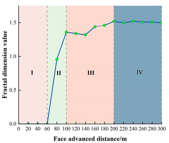 The relation between fissure fractal dimension and working face propulsion distance: (I) excavate 60 m; (II) excavate 100 m; (III) excavate 200 m; and (IV) excavate 300 m.