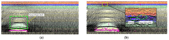 The interaction force inside the rock and soil mass is transmitted in the form of force chain, which can be divided into a strong and weak force chain based on their strength. The strong chains before excavation were distributed with uniformity in the lower layer of the model, while the weak force chains were numerous and [29,30] distributed in the loose layer. Overall, the density of force chains increased with increasing burial depth (Figure 12).
