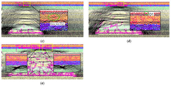 Evolution law of mining rock chain: (a) excavate 80 m; (b) excavate 100 m; (c) excavate 180 m; (d) excavate 200 m; (e) excavate 300 m.