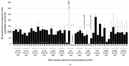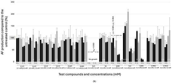 As shown in Figure 2a, 20 out of 52 concentration points (marked as an upper arrow (“^”)) exhibited enhanced AF (B1, B2) production compared to the untreated control (9 to 129%). As mentioned earlier, A. flavus produces AFB1 and AFB2 only, but not AFG1 and AFG2, whereas 2,4-D, 4I3M and 4-MOC did not enhance AF production at any concentrations examined. While CARV increased the AFB2 production at 0.2 mM (36% enhancement), both 4I3M and CARV at 0.4 mM showed the most potent anti-aflatoxigenic activity (81 to 97% inhibition), whereas the structural analog THY at 0.2 mM enhanced the AFB2 production at the highest level compared to other treatments (129% enhancement) (Order of AF inhibition (THY derivatives): 4I3M > CARV > THY; high to low).