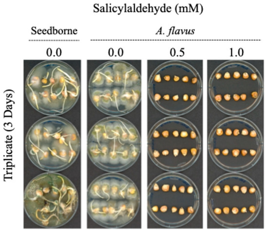 As observed in A. flavus, while SLD at 0.5 mM prevented the growth of A. parasiticus, the structural analog SA still allowed the fungal growth at the same concentration, which coincided with AFG1 and AFG2 enhancement in A. parasiticus (structure–activity relationship). Therefore, we selected two compounds, viz., SLD (potent antifungal activity in both A. flavus and A. parasiticus) and 4I3M (highest anti-aflatoxigenic activity), and investigated further for their utility as potential antifungal and/or anti-aflatoxigenic agents using corn seeds.