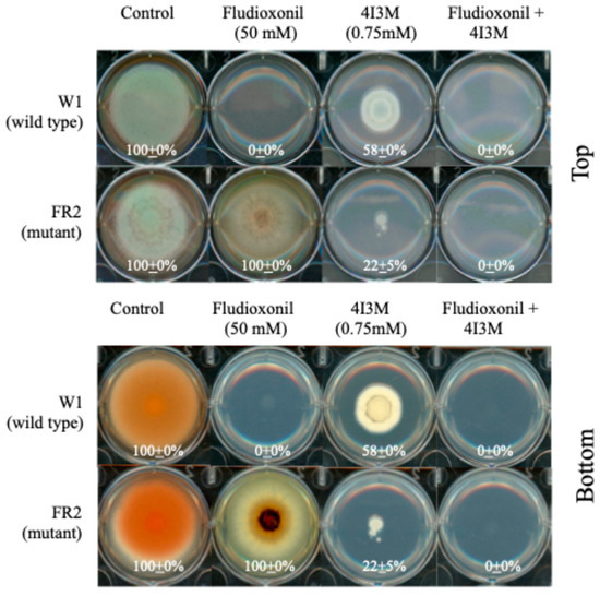 Penicillium expansum FR2 is a MAPK pathway mutant involved in oxidative stress signaling [49], thus showing tolerance to FLU, whereas it is more susceptible to oxidative stress reagents compared to the parental, wild-type strain. Using P. expansum (W1; wild type, parental strain) and FR2 (oxidative/osmotic stress MAPK mutant) as a “model” filamentous/mycotoxigenic (producing toxic patulins) fungal system, we examined the capability of 4I3M for overcoming FLU tolerance of P. expansum FR2. We tried to confirm the antifungal potential of 4I3M as a “redox-active” compound by targeting FR2. As shown in Figure 6, 4I3M at as low as 0.75 mM overcame FLU tolerance of P. expansum FR2. Of note, P. expansum FR2 exhibited higher sensitivity to 4I3M, as determined by the smaller colony size formed (viz., fungal growth: 58 ± 0% W1 vs. 22 ± 5% FR2 compared to the control). Therefore, results indicated that 4I3M is a redox-active compound, where the level of redox-activity (redox cycling) exerted by 4I3M was enough to induce the higher susceptibility of FR2 to 4I3M toxicity when compared to the parental strain W1.