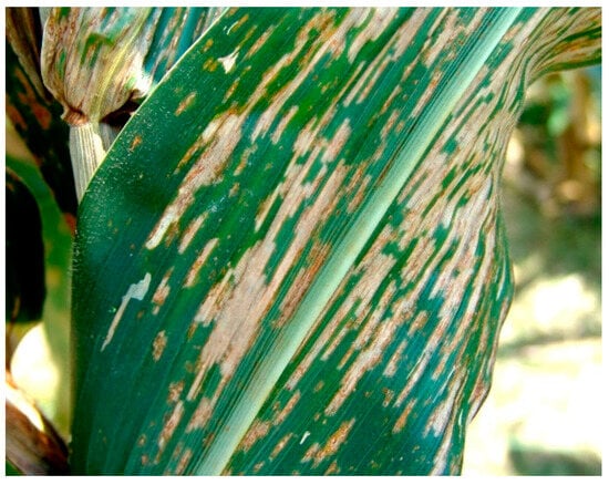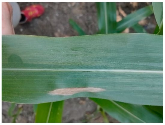 Gray Leaf Spot (as shown in Figure 2) was once widespread in Liaoning and the Huang-Huai-Hai region, with particularly severe outbreaks in parts of Liaoning from 2003 to 2004. In the early stages, the disease causes light brown spots on the leaves, which later develop into elongated gray-brown or gray lesions with brown edges. These spots are typically parallel to the leaf veins and range in size from 0.5 to 20 mm in length and 0.5 to 2 mm in width []. The main period of onset is from July to August, especially under conditions of high humidity or prolonged water film on the ground.