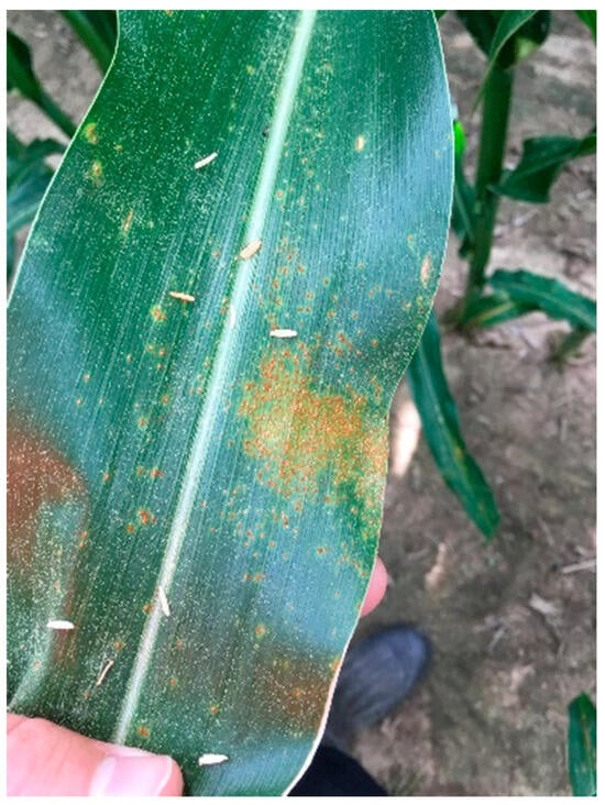 Rust (as shown in Figure 3) is a widespread disease affecting various production areas worldwide, including China. Notably, Southern Rust, which was previously confined to regions south of the Yangtze River, has progressively moved northward due to climate change. A severe outbreak occurred in 2007 in Liaoning and the Huang-Huai-Hai region, leading to significant losses. Initially, Rust manifests as greenish, creamy-white, or yellowish spots on maize. As the disease progresses, these spots develop into yellowish-brown or reddish-brown herpes-like spore masses, which threaten maize throughout its entire life cycle [].