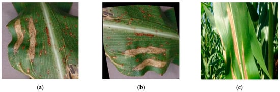 Northern Leaf Blight (as shown in Figure 1) exhibits various physiological subspecies and has undergone significant changes in its population structure. It has been observed in several major production areas. In the early stage of the disease, spots appear as large, yellow, or blue-gray water-soaked ovals on the leaves. In the middle stage, these spots evolve into spindle-shaped, elongated, or irregular patches. In the late stage, black and gray mold often grows on the patches []. Spring maize typically develops this disease from July to August.