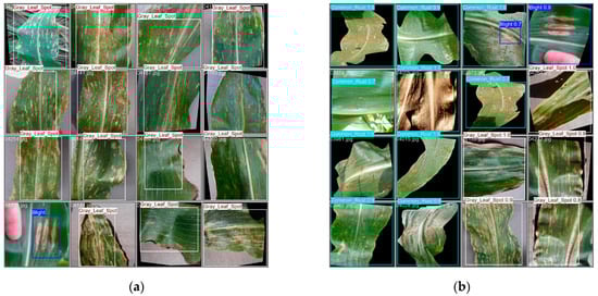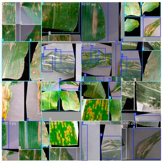 At the same time, to prevent overfitting, the images underwent data augmentation operations such as rotation, flipping, scaling, and cropping, as shown in Figure 4, and random mosaic augmentation, as illustrated in Figure 5, was applied during the training process. After the expansion, the dataset contains 1207 images of large spot disease with 1331 marked frames, 1197 images of Rust disease with 1305 marked frames, 1181 images of Gray Leaf Spot with 1245 marked frames, a total of 3585 images with 3890 marked frames. During the experiment, the ratio of the training set to the validation set was 8:2, and the input image size was 800 × 800, which can retain more image details and improve the accuracy of training. Figure 4 shows examples of the augmented dataset after data enhancement, while Figure 5 illustrates the mosaic augmentation applied during the training process.