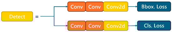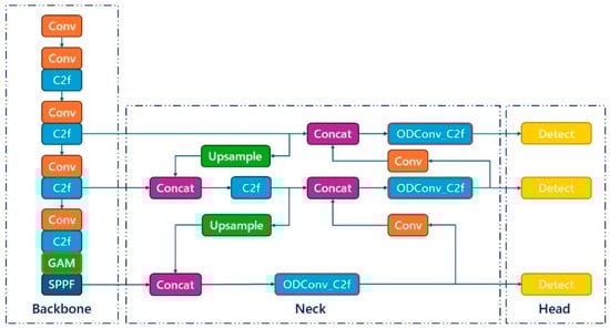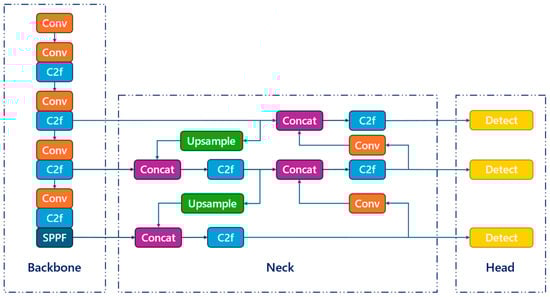 The YOLOv8 (You Only Look Once version 8) target detection model, released by the Ultralytics team in January 2023, was the state-of-the-art (SOTA) algorithm in the field of target detection for that year [,]. The YOLOv8 model maintains the classic framework of its predecessors, consisting of three main components: the Backbone network for feature extraction, the Neck network for feature fusion, and the Head for classification and localization. The three-part structure of YOLOv8 is shown in Figure 6.