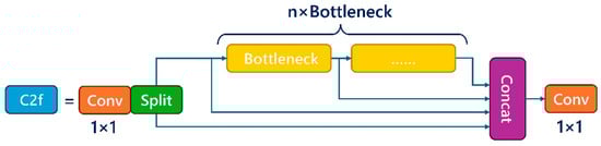 The Backbone component of YOLOv8 builds on the CSP (Cross Stage Partial) design concept and incorporates elements from the ELAN (Efficient Layer Aggregation Network) used in the C3 module of YOLOv5 []. The design was simplified by removing a Conv module to create a residual connection, transforming C3 into C2. Additionally, the introduction of more skip connections through the Split operation helped reduce model parameters, enhance gradient flow, and mitigate gradient disappearance. This modification led to faster processing speeds and was named the C2f module. This adjustment not only represents the most significant enhancement in the YOLOv8 network structure but also serves as a key point of optimization in this paper. Figure 7 shows the C2f structure.
