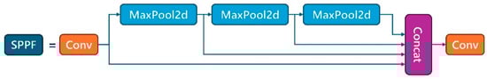 The structure of the Neck component was relatively complex. The SPPF (Spatial Pyramid Pooling Fast) module, which connects the upper and lower parts, follows the design principles of YOLOv5 to enhance the receptive field range of the feature map and improve feature separation []. Feature fusion is achieved through a PAN-FPN (Path Aggregation Network for Feature Pyramid Networks) structure. However, unlike the C2f module in the Backbone, the Bottleneck structure of the C2f module in the Neck network does not employ residual connections. Figure 8 shows the SPPF layer, and the Neck structure can be found in Figure 6.