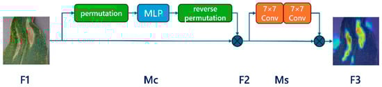 As illustrated in Figure 10 and represented by Equations (2) and (3), the feature map F1 is input into the GAM, where it undergoes channel attention processing (denoted as Mc) to obtain F2. Unlike traditional channel attention mechanisms that use global average pooling to generate channel attention maps, the GAM’s channel attention mechanism employs a permutation operation to unfold the spatial dimensions and directly inputs them into a fully connected layer to derive the channel attention map. This approach retains more global and spatial information, which is also utilized to generate spatial attention maps, ensuring both globality and interactivity. Subsequently, F2 is fed into the spatial attention module (denoted as Ms), where spatial information is compressed through two 7 × 7 convolutions. The output is then smoothed using a Sigmoid function to produce the spatial attention map. Finally, the spatial attention map is multiplied with F2 to obtain the final output feature map F3.