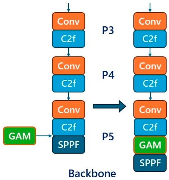 The GAM can make more use of global information to capture richer target information and adopt a relatively simple design. It can improve model performance without significantly increasing the computational cost and is more suitable for the improvement of lightweight networks. This paper added the GAM module in front of the SPPF layer, combined global attention and multi-scale pooling of the SPPF layer, and further optimized the receptive field, thereby improving the detection ability of complex backgrounds. Maize disease recognition must consider both relatively small spots and the overall distribution of spots on the leaves and treat the entire area with spots as the target. Therefore, multi-scale global information is also very important. Putting it in P3 will result in too much attention being paid to small targets, and due to the high resolution of the feature map, it will greatly increase the computational overhead, which is not conducive to light weight. Adding it to the Neck can also improve the ability to process multi-scale information, but it will also greatly increase the computational overhead. Therefore, adding it before the SPPF layer can not only improve the expression of global features and optimize the extraction of multi-scale information, but also result in high computational efficiency. Based on the previous analysis, this paper places the GAM module before the SPPF layer, as shown in Figure 11.