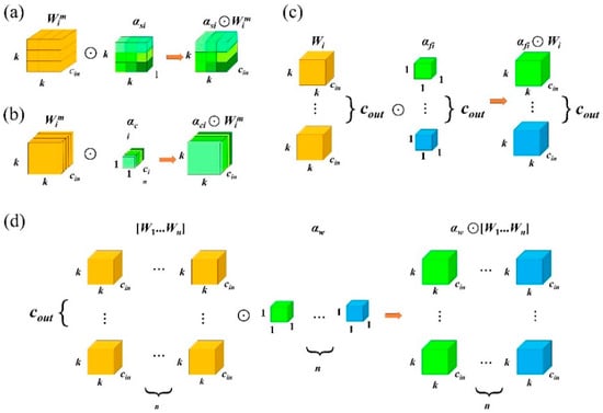 As shown in Figure 12, (a) is a schematic diagram of Location-wise Multiplication in the location dimension; (b) is a schematic diagram of Channel-wise Multiplication in the channel dimension; (c) is a schematic diagram of Filter-wise Multiplication in the output channel dimension; and (d) is a schematic diagram of Kernel-wise Multiplication in the convolution kernel dimension.