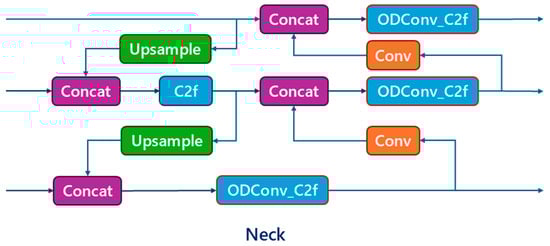 In the original YOLOv8 network, there were two types of C2f modules: one located in the Backbone and the other in the Neck. The Backbone’s primary function is to extract multi-scale basic features. Replacing the C2f module in this part could potentially enhance feature expression capabilities. However, a complex Backbone design may lead to information redundancy and increased computational burden. On the other hand, modifying the C2f module in the Neck can significantly improve feature fusion quality, optimizing the fusion and transmission of multi-scale features and thereby enhancing final detection performance. Experimental results demonstrated that improving the three C2f modules at the junction of the Neck and Head produced the best outcomes. This approach not only enhanced feature expression but also maintained computational efficiency, leading to significant improvements in detection performance. The position where the ODConv-C2f is added is shown in Figure 14.