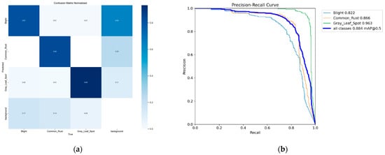 Figure 16 shows the confusion matrix, which reflects the degree of confusion in each category. The darker the main diagonal color block, the more accurate the detection is. The darker the non-main diagonal color block, the easier it is to confuse the two items in the horizontal and vertical directions. The figure shows the PR curve, which is the mAP value obtained by integrating each curve. Combining the two figures, the PR curve of the large spot disease is far away from the upper right of the image due to the confusion between the large spot disease and the background.