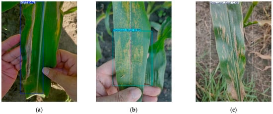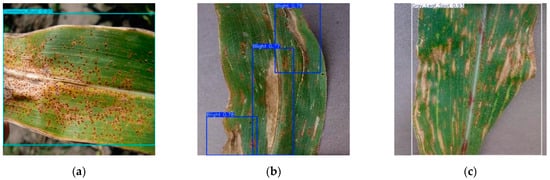 Field photo inference results. (a) Northern Leaf Blight; (b) Rust; (c) Gray Leaf Spot.
