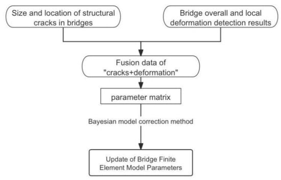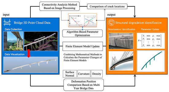 This paper aims to establish a comprehensive process from the preprocessing of bridge point cloud data to the identification of bridge structural degradation (including cracks and spatial morphological changes), and ultimately to update the parameters of the bridge finite element model based on the aforementioned detection results. Figure 1 illustrates the research vision and approach of this study.
