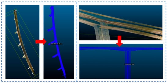 Following the preliminary processing of bridge point cloud data with CloudCompare, this paper employs a conditionally repeated sparse processing method for the point cloud, which simplifies and reduces the volume and storage requirements of the data while preserving the relative density values among different features. This strategy is crucial for maintaining the reliability of the subsequent analysis phases [39]. Figure 2 clearly illustrates the comparison between the processed point cloud data and the original data following the aforementioned steps.
