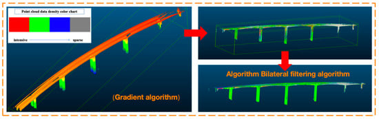 The authors adjusted the relevant parameters in CloudCompare, including the gradient threshold T (gradient threshold), search radius R (search radius), neighborhood size S (neighborhood size), and kernel size. Through manual debugging, it was found that the applicable numerical ranges for the four parameters in the bridge point cloud data processing are 0 ≤ T ≤ 1; 0.1 ≤ R ≤ 1; 5 ≤ S ≤ 20; 10 ≤ kernel size ≤ 20. Finally, filtering was performed using gradient-based techniques.