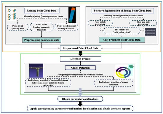 The research objective involves projecting complex three-dimensional information onto multiple planes to construct a simplified two-dimensional set. Furthermore, by quantifying sparse regions within the data, potential crack locations are visualized. This method aids bridge engineers in selectively conducting on-site inspections for visible crack conditions. In relation to this methodology, the authors present a comprehensive process model for detecting structural cracks in bridges, as shown in the Figure 6 below.