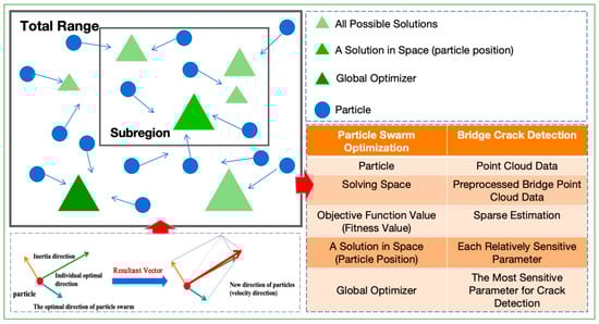 In summary, the direction of a particle’s next iterative move is determined by a combination of the inertia direction, the individual best direction, and the global best direction. Figure 7 illustrates the basic principles of the particle swarm algorithm, direction determination, and its mapping in the bridge crack identification process.