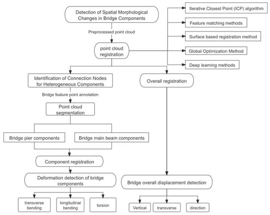 For detecting spatial morphological changes in bridges, it is crucial to consider both the structural characteristics of individual components and the overall form of the bridge. Therefore, the detection process should be divided into two categories: the deformation detection of bridge components and the overall displacement detection of the bridge. The detection tasks are completed through steps including feature recognition, point cloud segmentation, point cloud registration, and deformation parameter comparison, ensuring the safety and reliability of bridge engineering. The detailed framework of the deformation detection process model proposed in this paper is shown in Figure 9.