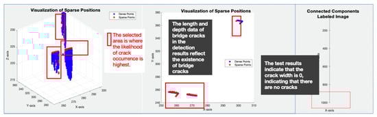 Among them, connectivity analysis, as an important part of the algorithm, is primarily used in this study to determine the connected regions composed of pixel points in an image. In bridge crack detection, the aim is to identify crack areas formed by sparse points in the point cloud data. This analysis is typically based on the theory of connectivity in image processing and can be divided into three types: “region-based connectivity analysis”, “graph-based connectivity analysis”, and “hierarchical connectivity analysis.” Among the three types, since bridge cracks usually appear as connected regions in the point cloud data, and “region-based connectivity analysis” can effectively extract features such as the shape and size of cracks, it can well adapt to different types of cracks and has strong robustness to the shape and size of cracks. Therefore, this study selects this analysis method. By generating a labeled image, each connected region is assigned a unique label (each connected region consists of a set of interconnected pixel points sharing the same label), and then the “regionprops function” is used to calculate the attributes of each connected region, such as the major axis length and minor axis length. Finally, the identification and calculation of the attributes of crack regions in the point cloud data are completed, achieving the purpose of quantifying cracks in the bridge crack detection process.