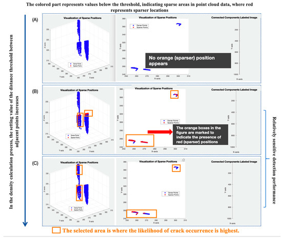 Results of the crack detection program based on different proximity thresholds for neighboring points in density estimation: (A) Results with a parameter selection of 0.01, (B) Results with a parameter selection of 0.08, (C) Results with a parameter selection of 1.0.