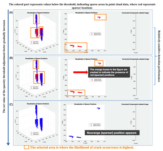 Results of the crack detection program based on different tuning parameter for sparsity threshold: (A) Results with a parameter selection of 0.5, (B) Results with a parameter selection of 1.0, (C) Results with a parameter selection of 2.0.