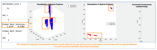 As shown in the numerical results on the far left of Figure 16, two parameters were learned and iterated using the particle swarm optimization algorithm. In the density calculation, the optimal values for adjusting the distance threshold between neighboring points and the sparsity threshold were found to be 1.6147 and 0.2368, respectively. Furthermore, after inputting these parameter values into the crack detection program, relatively accurate crack detection results were obtained (the detection results for areas with a higher probability of crack presence exhibited a red–blue distribution similar to the standard values).