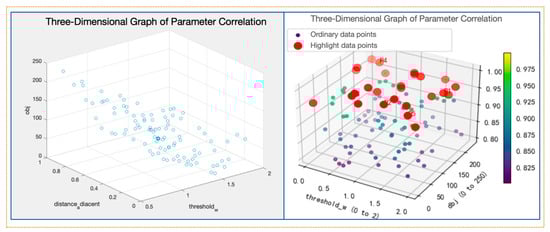 Figure 17 presents the three-dimensional graph related to the parameters involved in this study. By observing the data distribution, it was found that the data points exhibit a normal distribution in most areas, with some areas showing clustering, such as (0.8, 1.5, 250). This indicates that the dataset is relatively stable but with strong correlations or outliers. In future research, further data analysis and validation are needed to confirm the validity of these points.