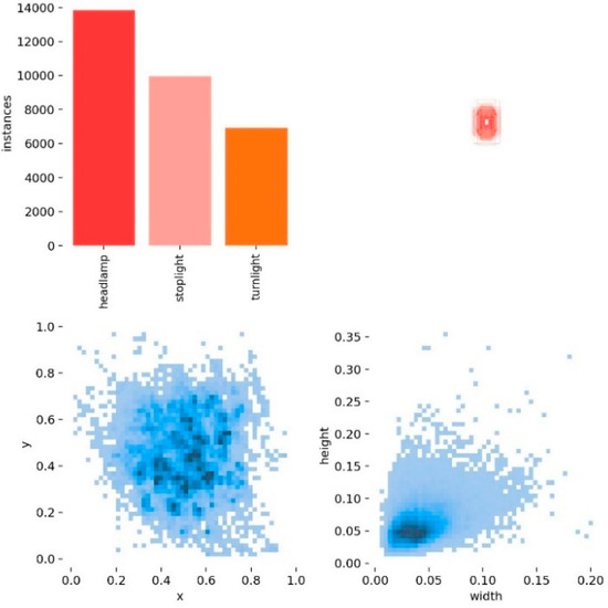 The headlamp dataset was the data information collected in the system of a research institute of the Ministry of Public Security in a real scene, including headlamp data in different weather, different angles, different workstations, different models (both large and small vehicles), and indoor and outdoor situations. A total of 18,815 images are included, of which 16,034 are used as the training set, 1781 as the test set, and 1000 as the validation set; they are divided into the three different types of labels most commonly used in vehicles: headlamp, stoplight, and turnlamp, where the number of individual classified annotations are 13,350, 10,012, and 76,712, respectively, and 10,012, and 7679, respectively, for each category of labeling. As Figure 3 shows the visualization results of this dataset, most of the labels have relative widths between 0.01 and 0.03 and heights between 0.02 and 0.05, which are small in size, and this is one of the biggest challenges affecting the performance of headlight detection.