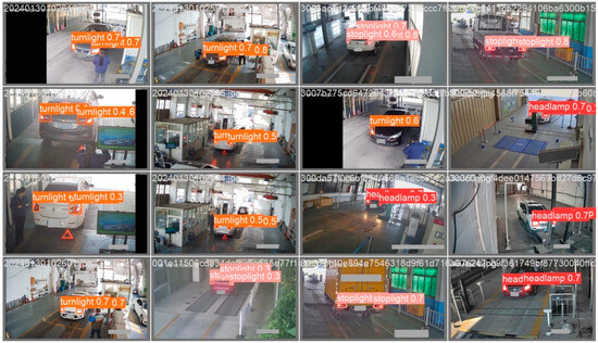 As shown in Figure 4, an illustrative snapshot of the headlight dataset within the context of vehicle inspection environments, it becomes evident that the dataset encapsulates a diverse range of vehicles, encompassing not only compact models like cars and SUVs but also extensive ones such as trucks, buses, and vans, among numerous other varieties. This diversity, coupled with the inherent variations in the headlights across these distinct vehicle types, poses significant challenges for algorithmic models tasked with accurate detection. Specifically, the headlights represent one of three crucial light types, alongside brake lights and turn signals (both front and rear), underscoring the complexity of differentiating between them. Notably, the presence of multiple headlights simultaneously illuminated in various scenarios introduces substantial interference in the detection process, exacerbating the need for precision in distinguishing between different headlight sources. Furthermore, in some images, the headlights appear distant from the viewpoint, compounded by robust environmental distractions (including reflections, varying exposures, and other factors) that are inevitable in real-world scenarios. To tackle these multifaceted difficulties, the algorithmic model presented in this paper is dedicated to overcoming these challenges, thereby facilitating the advancement of computer vision-based intelligent detection in practical industrial applications. By addressing these complexities, our approach strives to enhance the reliability and efficacy of headlight detection systems in real-world settings.