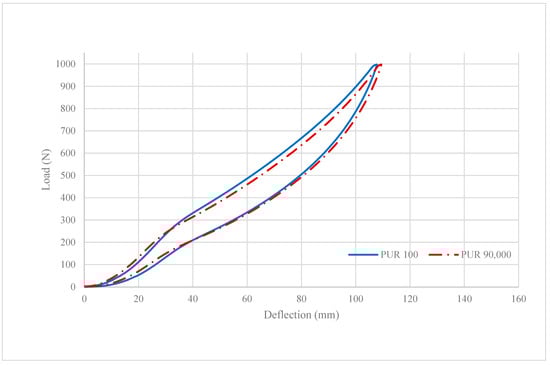 The load/deflection curves of the PUR samples are shown in Figure 2. At the beginning of the research, a force of 1000 N caused the maximum deflection of 107.79 mm (PUR 100), while at the end, it was 109.43 mm (PUR 90,000).