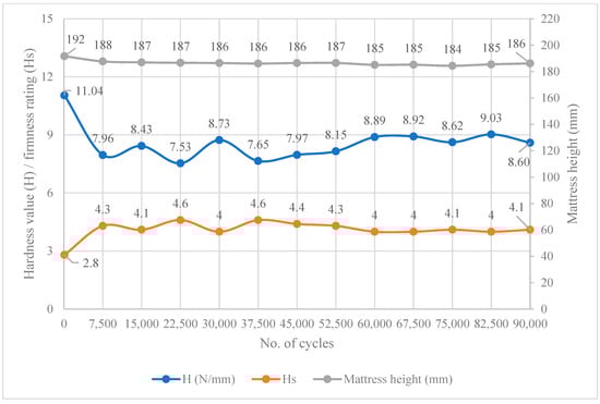 The firmness rating (Hs) remained relatively stable, starting at 7.3 and ending at 7.1, with minor fluctuations throughout the cycles. The firmness rating remained more stable than the hardness value, which indicates that the subjective firmness (perceived comfort) of the mattress did not change significantly over the cycles. Minor fluctuations in Hs suggest that while the material properties might be altered slightly, the overall user experience in terms of firmness remains consistent.