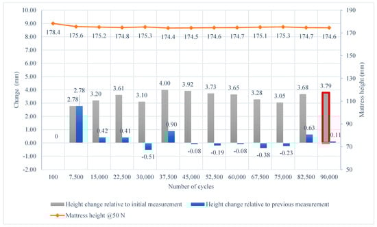 To determine the height loss, mattress heights were measured under a load of 50 N. As shown in Figure 4, the initial height of the mattress was 178.4 mm, which decreased slightly over the cycles. This indicates gradual compression of the mattress material under repeated loading. By 90,000 cycles, the height was 174.6 mm, which means that the height loss of the PUR mattress was 3.79 mm.
