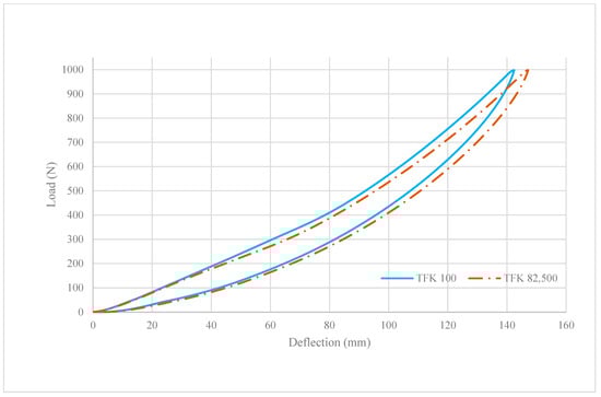 The load/deflection curves of the TFK sample are shown in Figure 5. At the beginning of the research, a force of 1000 N caused the maximum deflection of 142.43 mm (TFK 100), while at the end, it was 147.13 mm (TFK 82,500).